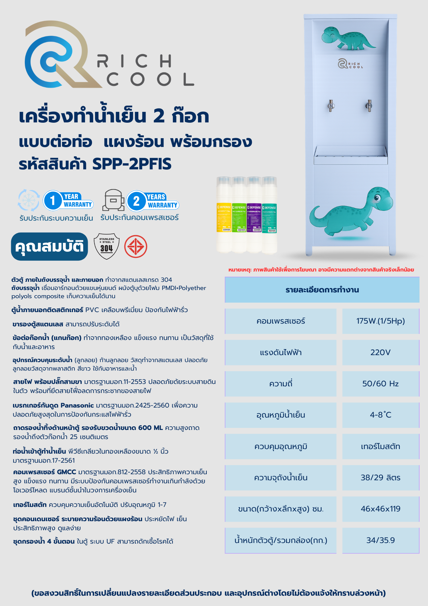 • ตัวตู้ ภายในถังบรรจุน้ำ และภายนอก ทำจากสแตนเลสเกรด 304