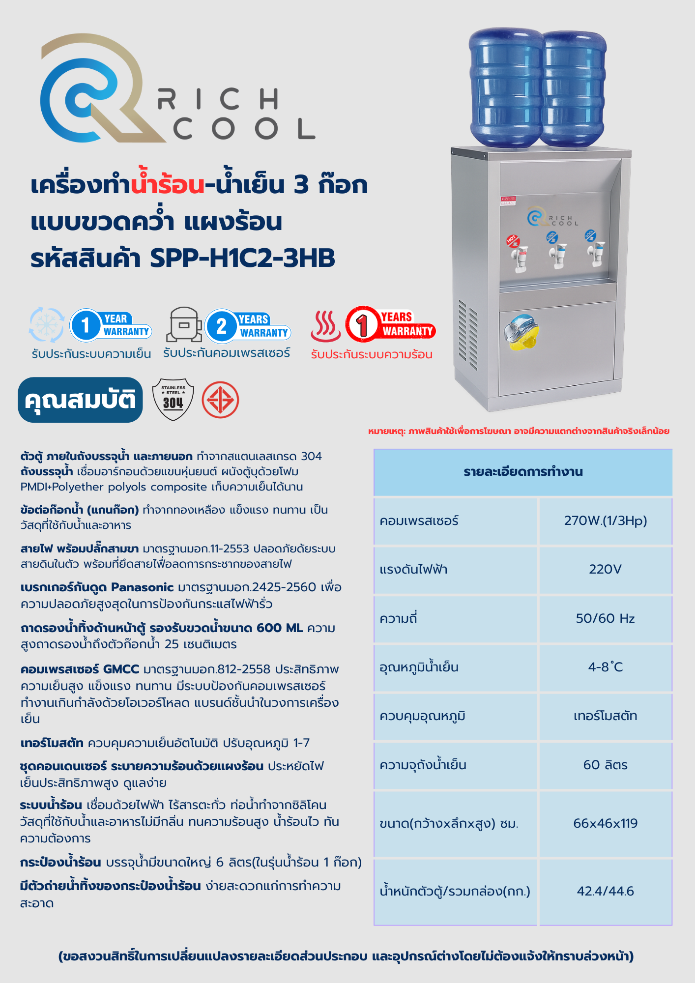 • ตัวตู้ ภายในถังบรรจุน้ำ และภายนอก ทำจากสแตนเลสเกรด 304